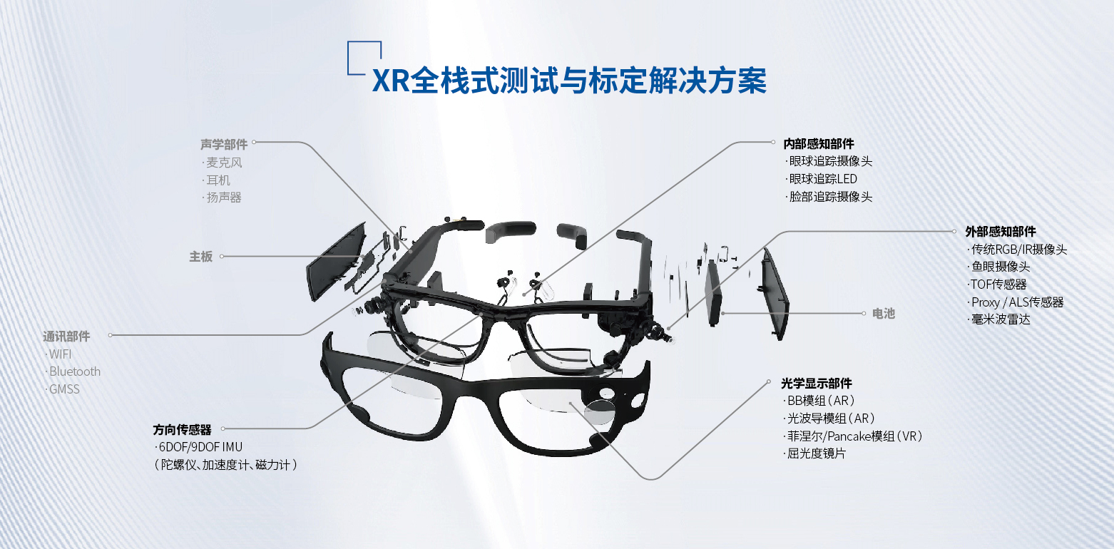 在 XR 測試與標(biāo)定領(lǐng)域,鷹諾國際可提供覆蓋內(nèi)部感知部件、外部感知部件、光學(xué)顯示部件、方向傳感器,以及通訊部件、聲學(xué)部件等的整機(jī)、模組、零部件測試與標(biāo)定解決方案。